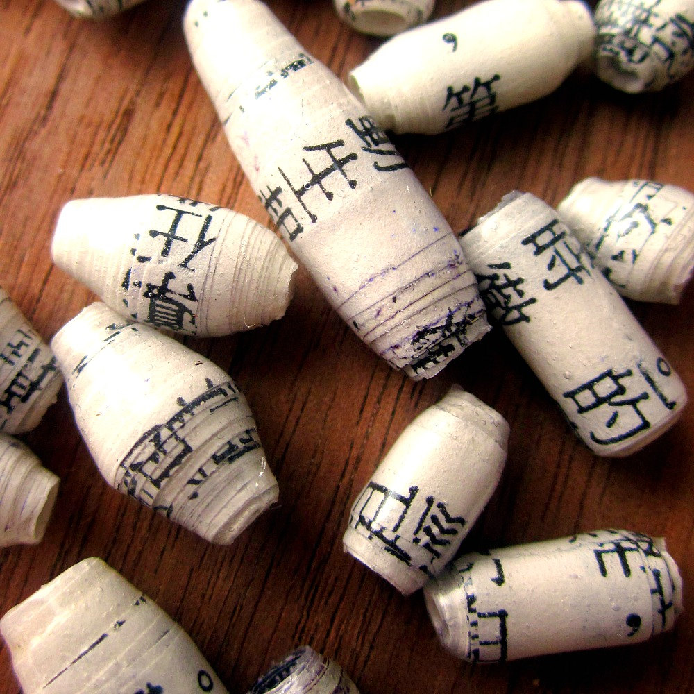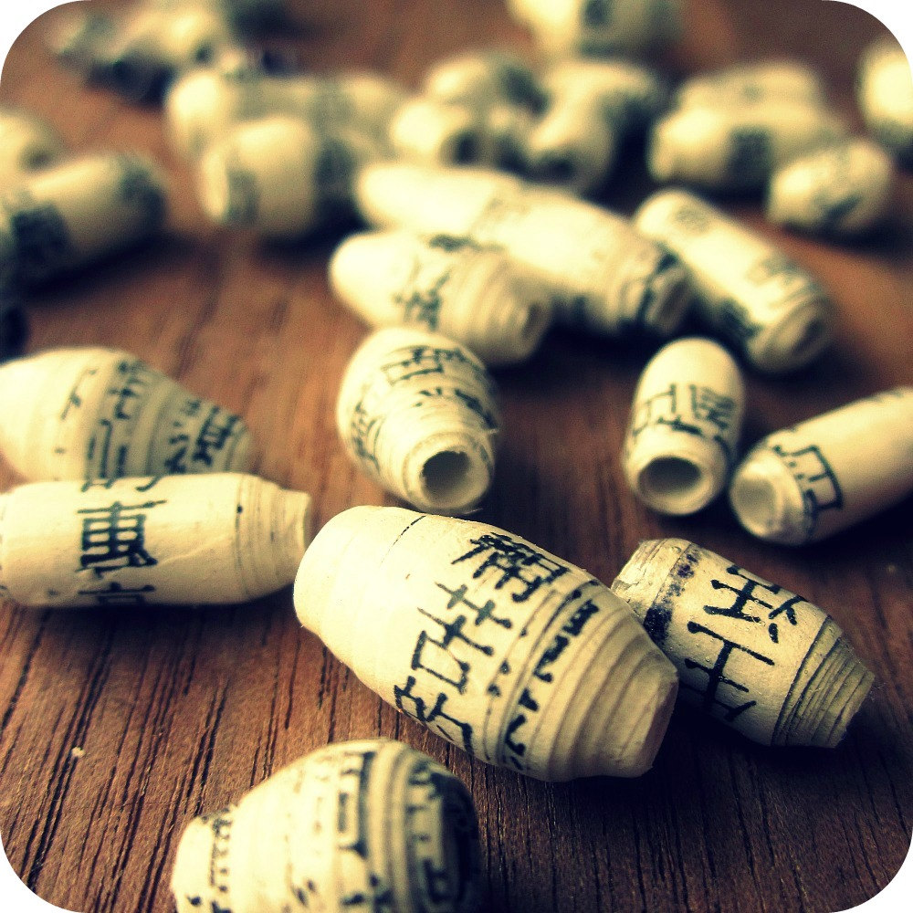 Asian inspired paper beads, handmade from salvaged paper. These are my version of recycled paper beads. I make each one by hand from used magazine, catalog, and in this case, salvaged book pages that boast Chinese characters. I glaze them with several coats of gloss sealant for moisture resistance and durability. The difference is a bright, smooth, glass-like finish which illuminates the colors of the recycled paper underneath and extends the life of the beads.