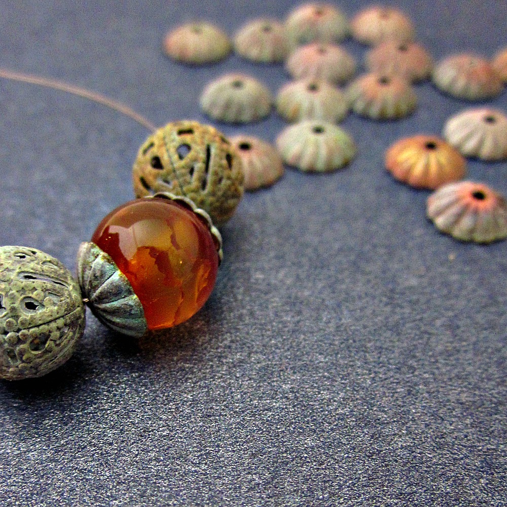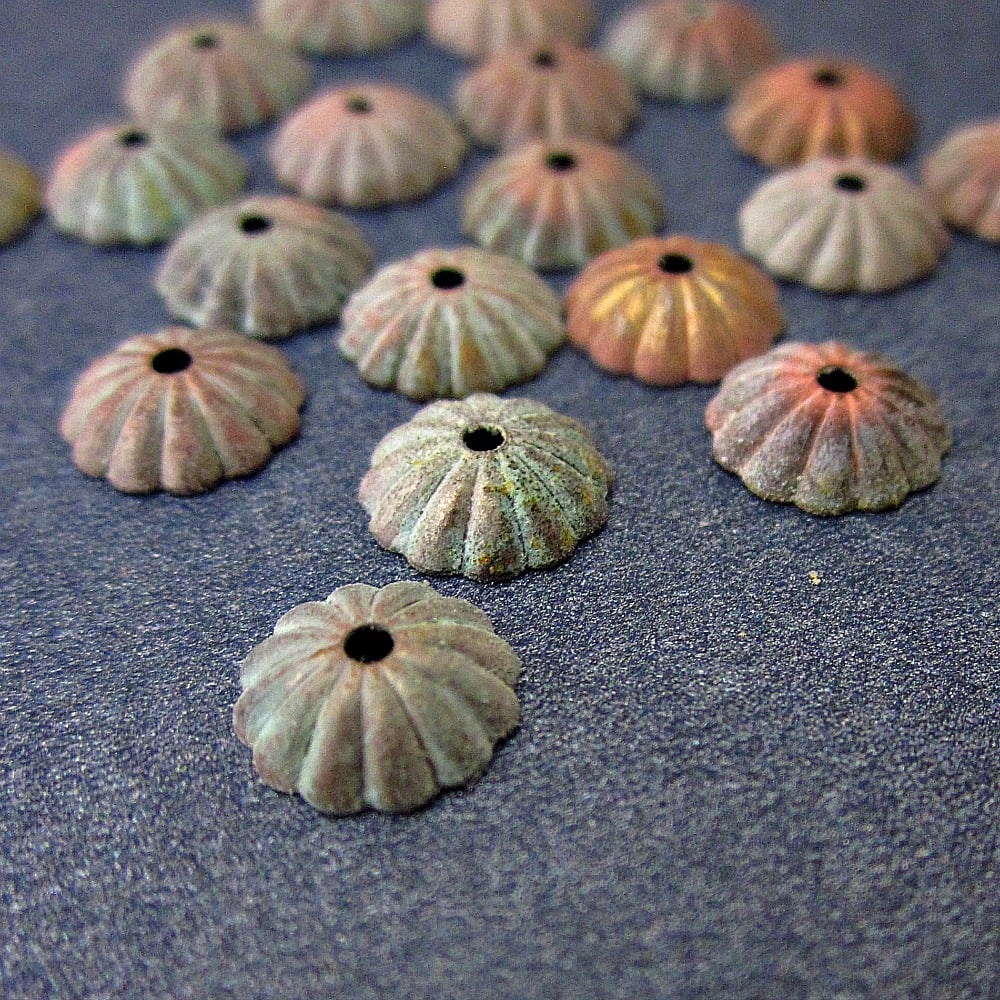 Fluted Bead Caps, Green and Rust Hand Patinated, 20 pcs: Sea Urchin Caps