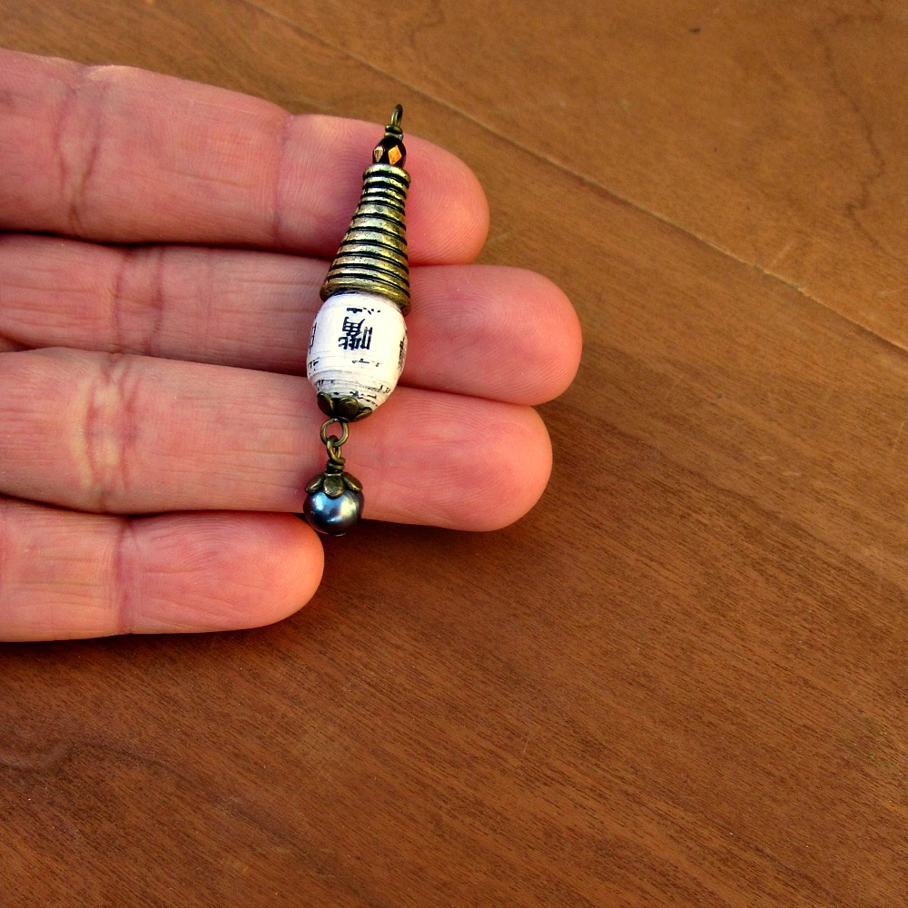 A rustic, vintage style paper pendant, handmade from salvaged book pages. The paper features chinese characters. Embellished with a contrasting blue pearl and rustic brass findings.