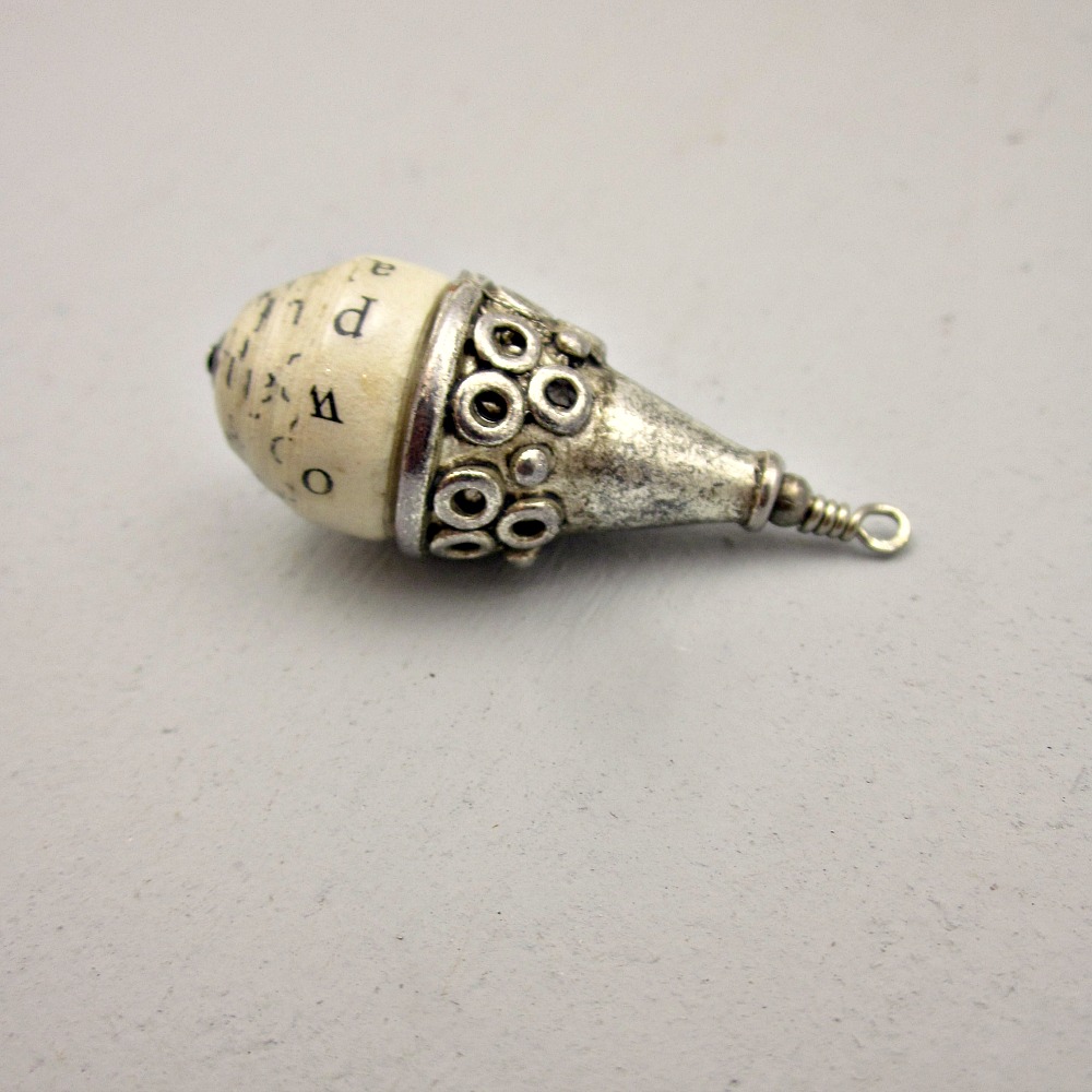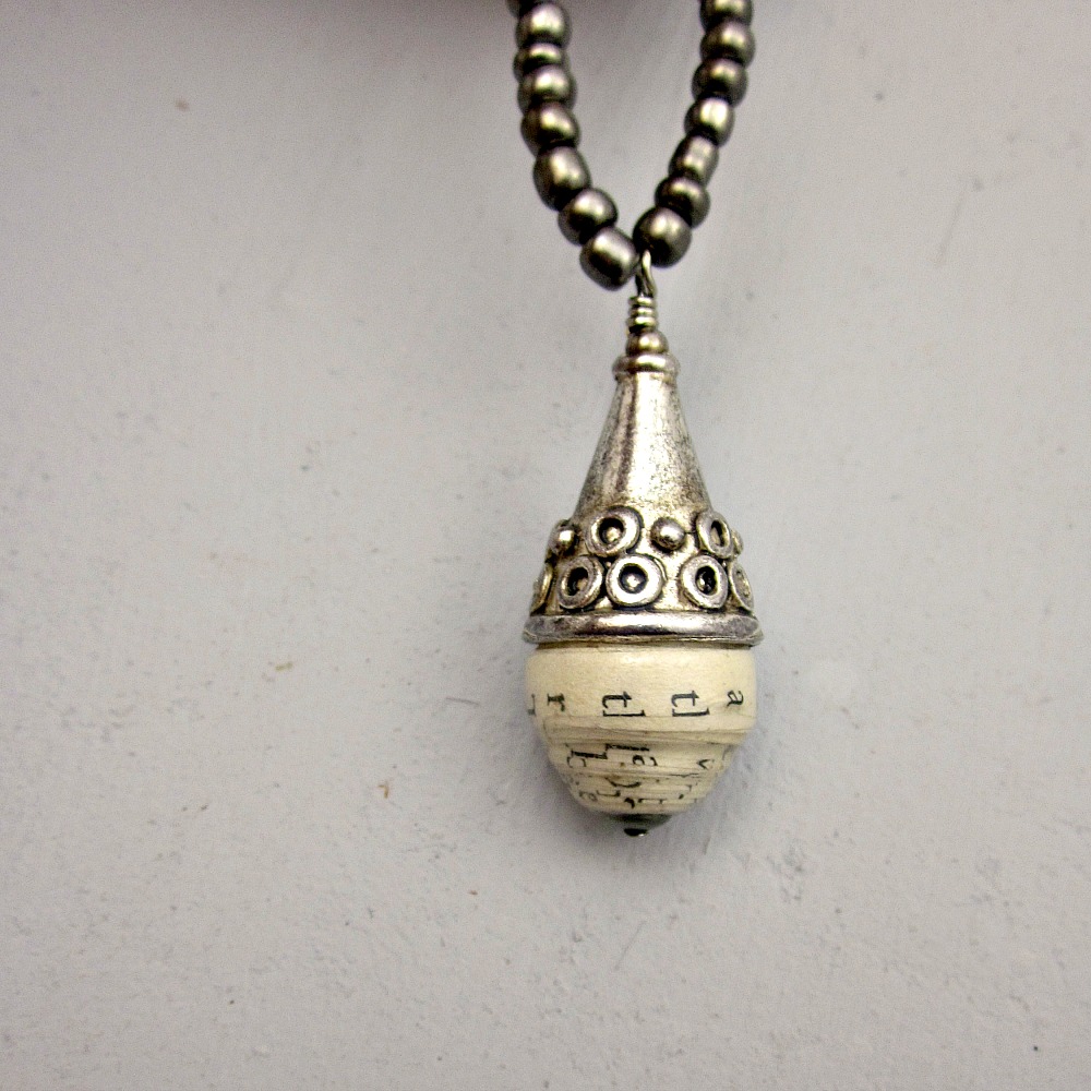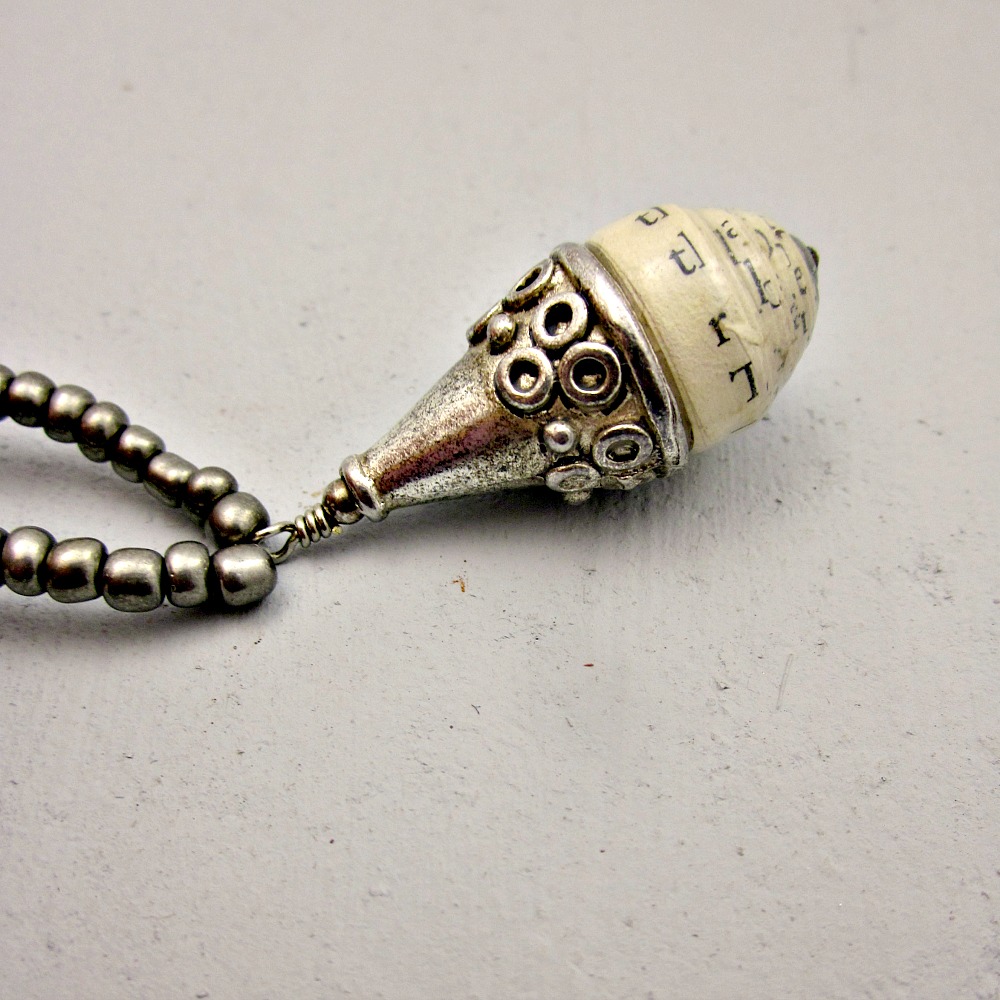 A rustic paper pendant, handmade from salvaged book pages. Salvaged paper, tinted by age, paired with rustic silver for a unique focal piece.