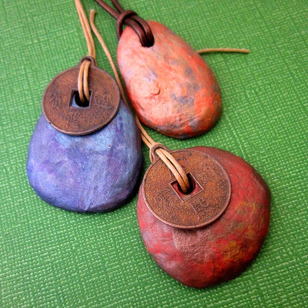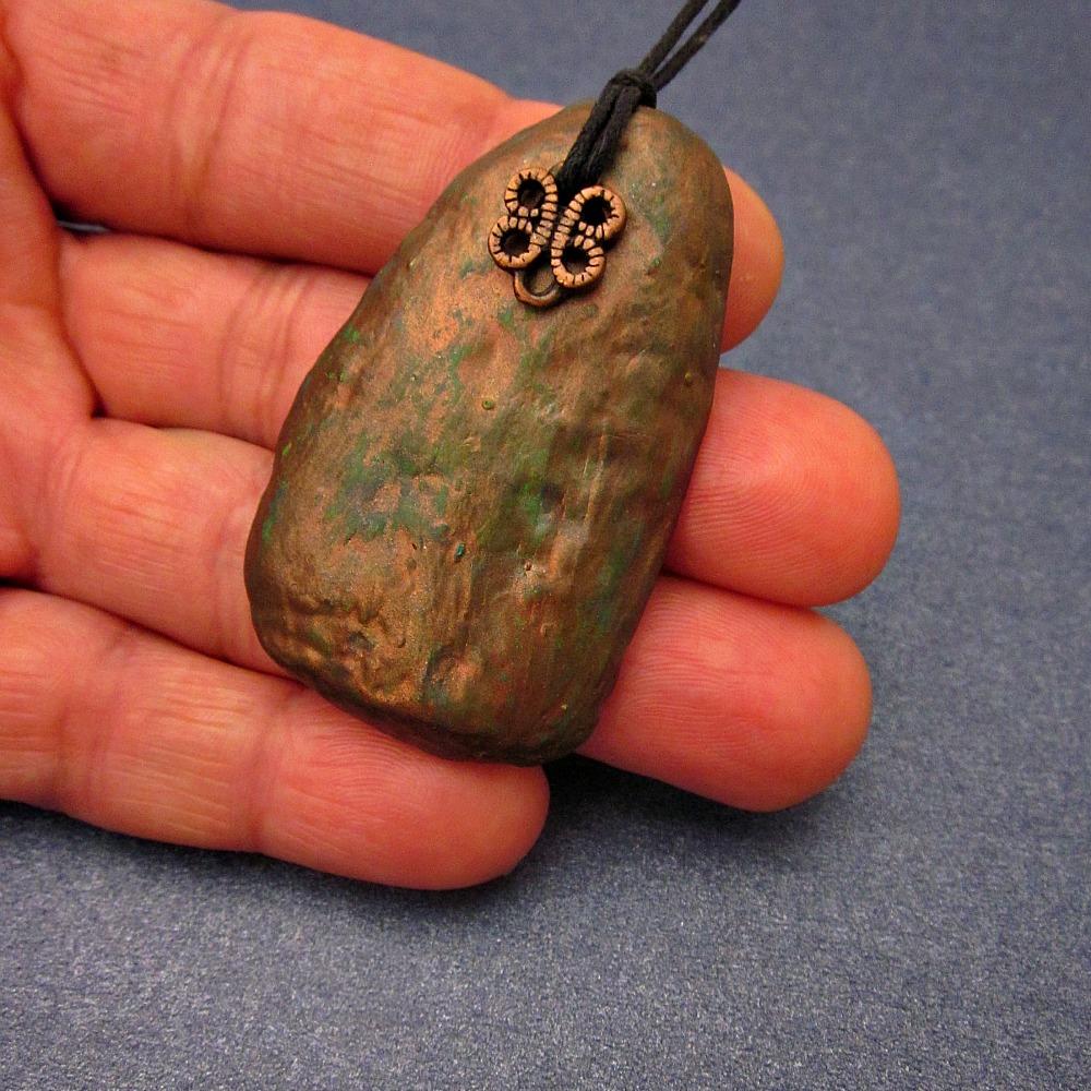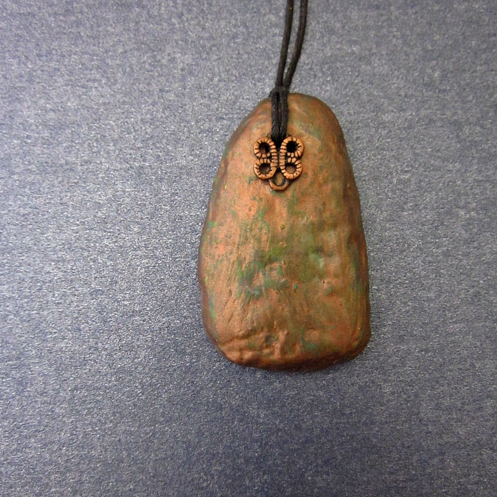 A rustic handmade copper paper mache pendant. Sculpted from a pulp of salvaged papers, hand-painted in earthy metallic tones (dark aqua and copper), and sealed for moisture resistance and durability. Comes with the copper accent shown, for use with this pendant or your other projects. Wire charms the accent piece, to further decorate this eco-friendly pendant, or leave as is. Cord not included.