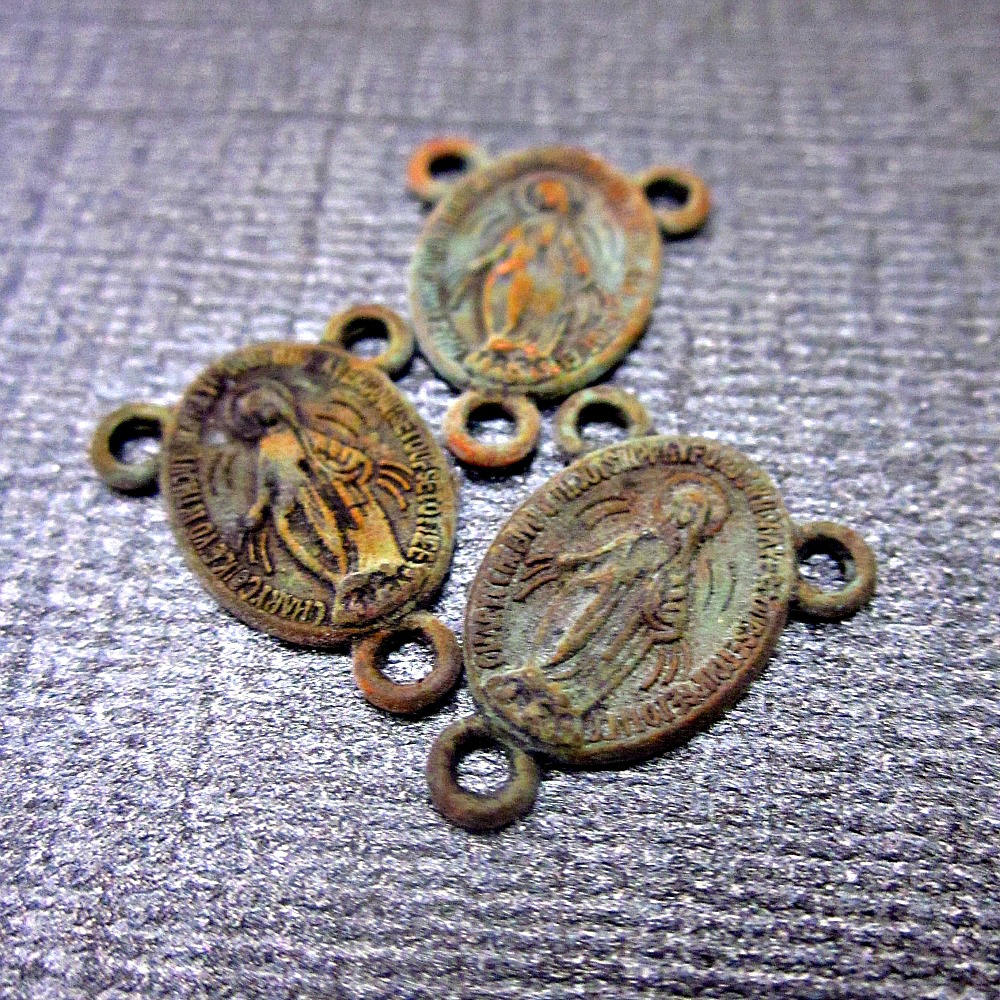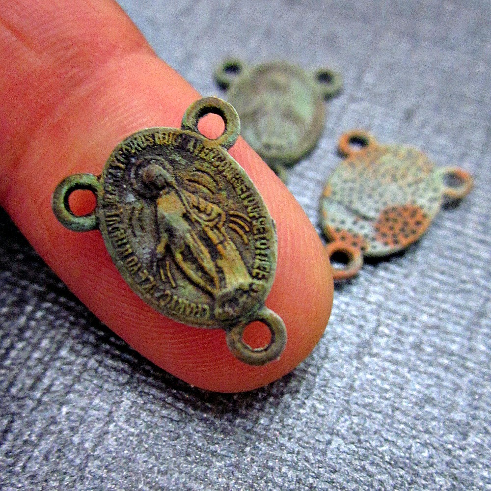 A set of 3 rosary connector findings with hand distressed finish. I treated these pretty little findings by hand to create their rustic bronze-green patina. Use them for rosaries or other projects. Sealed in several coats of matte sealant to protect the finish. You will receive the 3 connectors only. Other items shown are for example only.