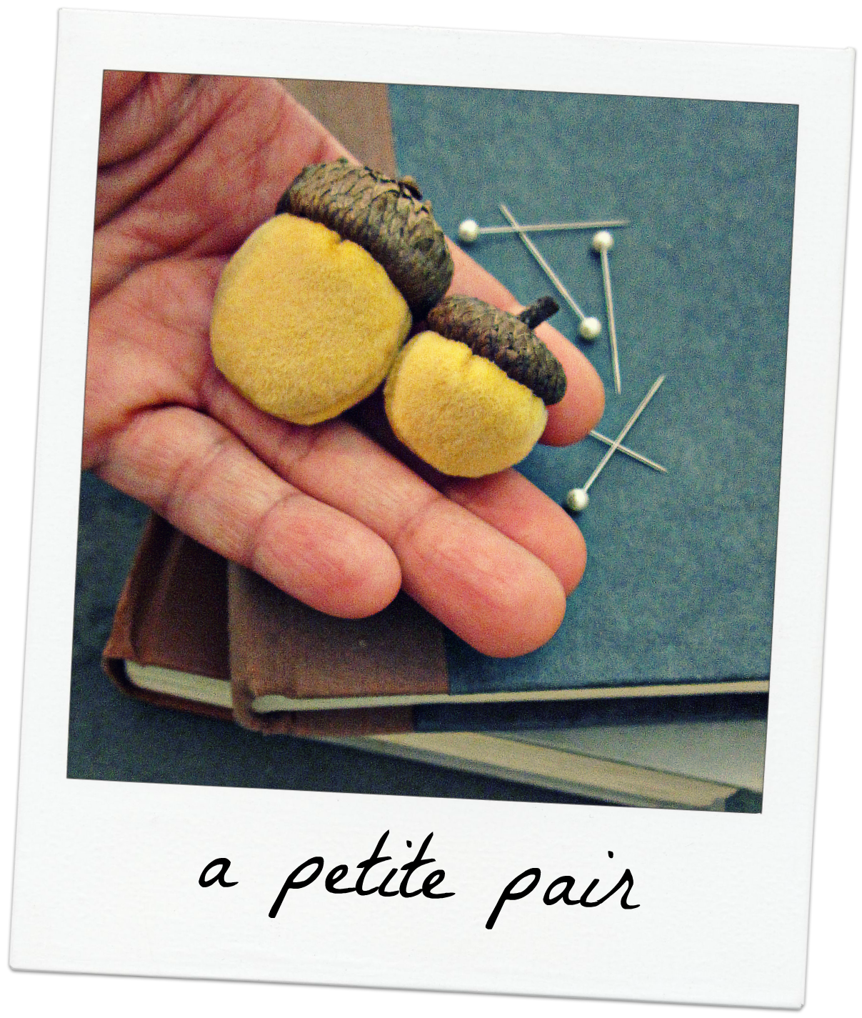 A pair of handmade mini pincushions. Natural acorn caps top off soft golden yellow velvet. These hand sewn, sand-filled minis are portable and handy for small projects or workspaces. Or simply use them for decor!