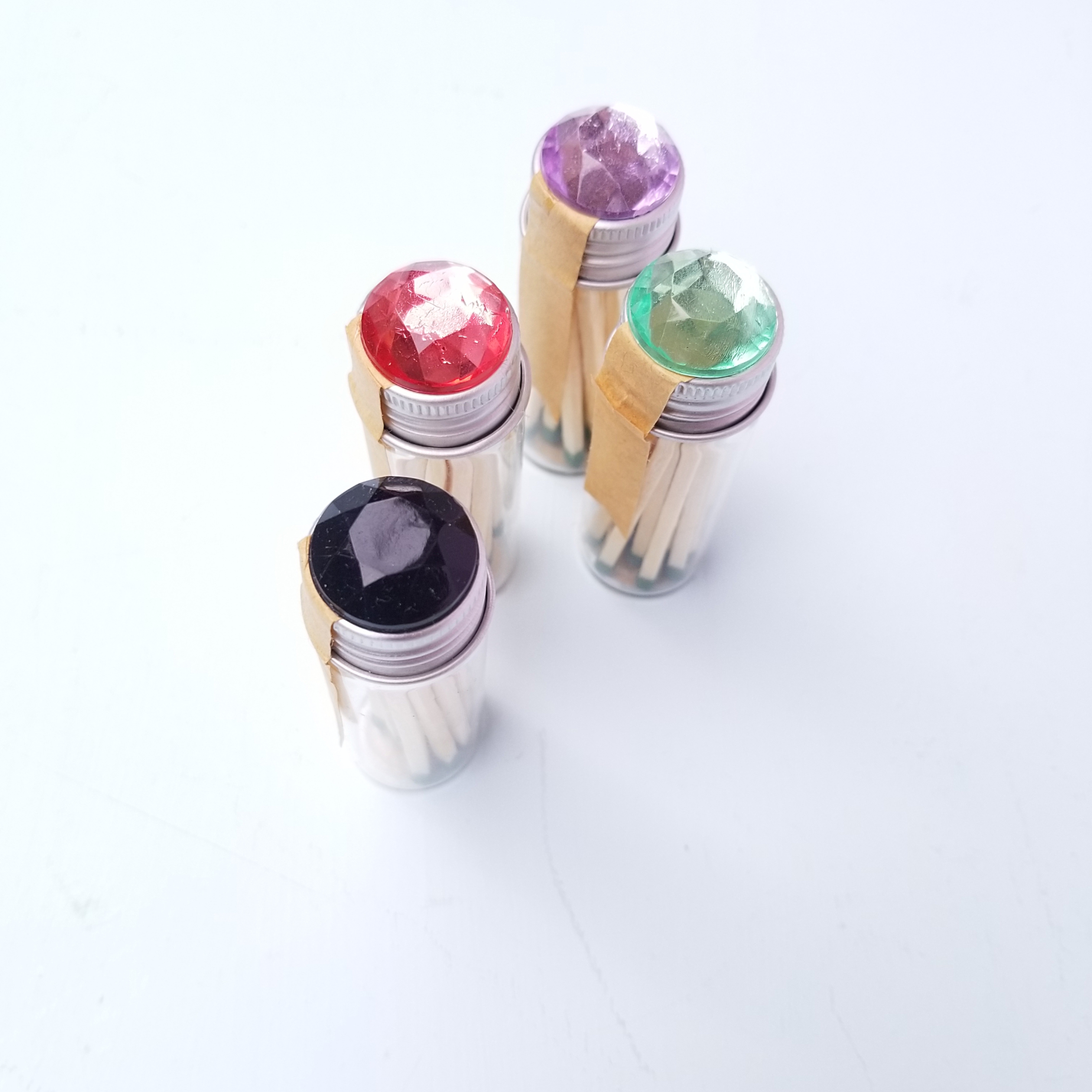 Miniature glass match bottles. Featuring pretty rhinestone tops and striking paper on their bottoms- these are a pretty, refillable way to store and display matches safely. Each bottle contains 18 matches.
